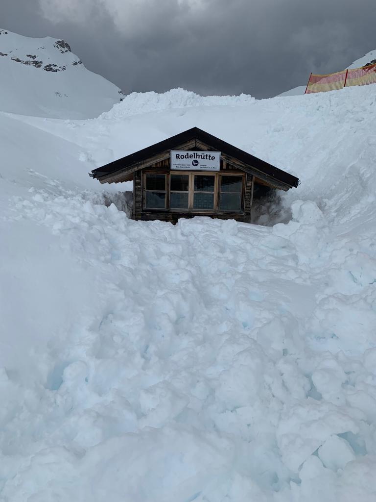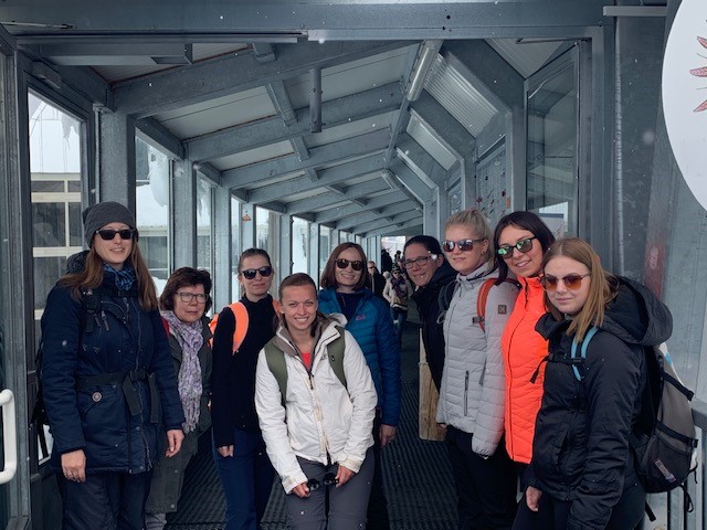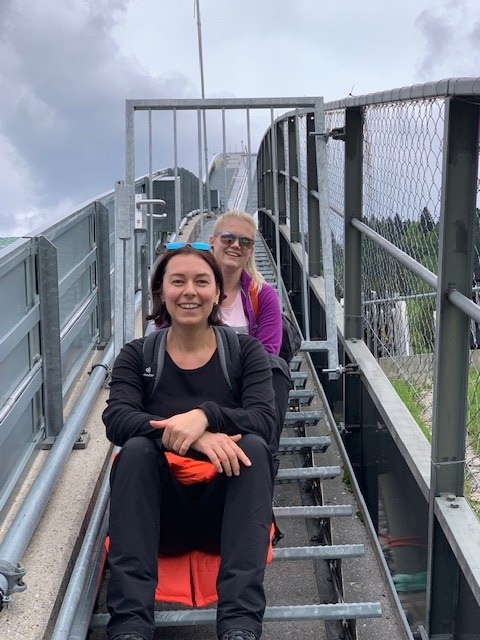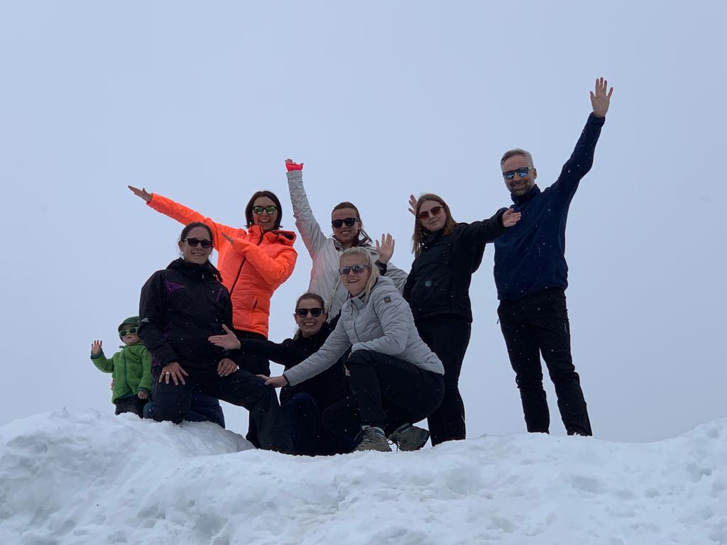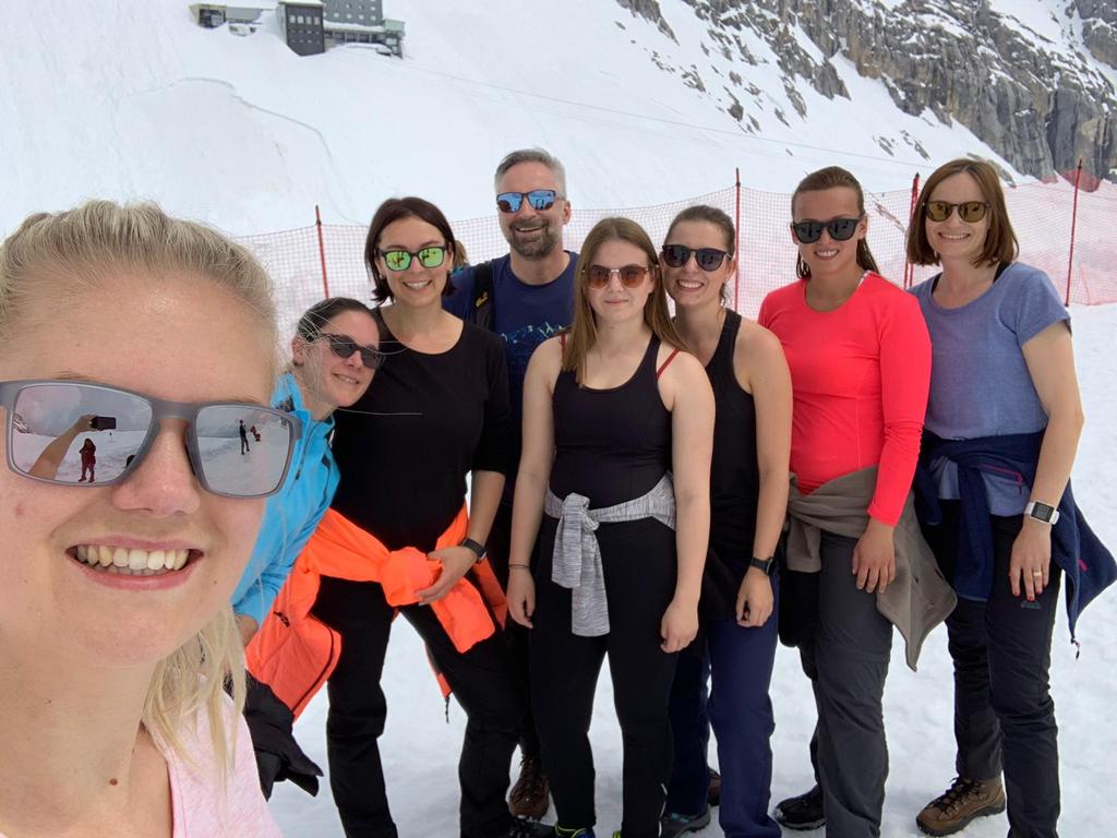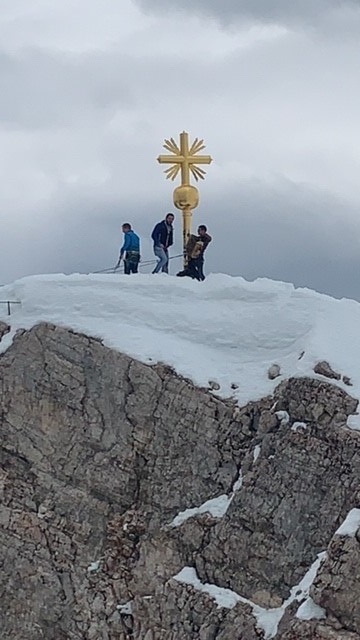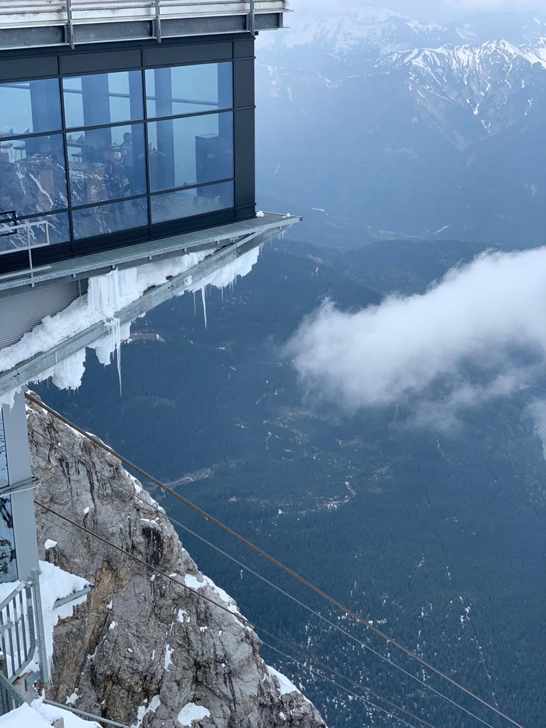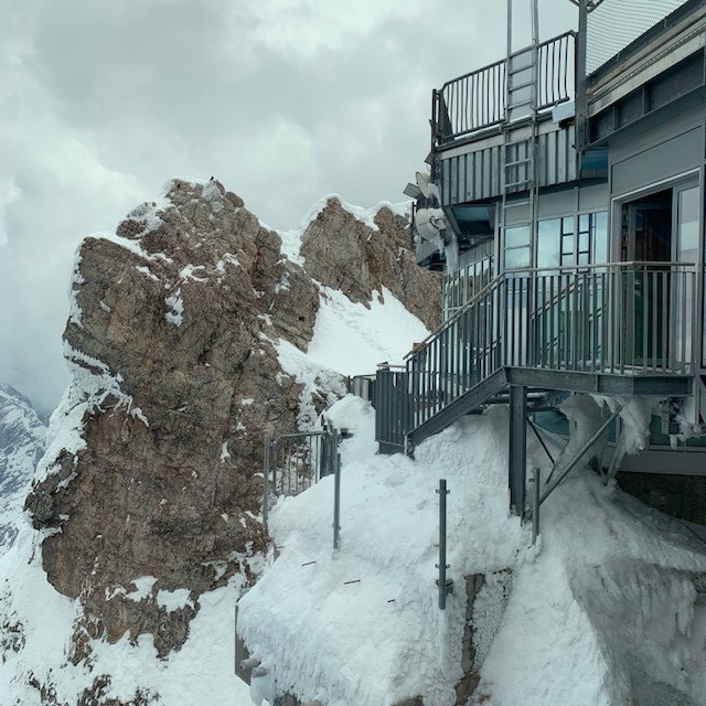 Der Samstag stand dann voll im Zeichen der Zugspitze. Mit der Zahnradbahn ging es vormittags Richtung Zugspitzblatt, wiederum und rein zufällig begleitet durch die Südtiroler Stimmungsband. Auf dem Zugspitzplateau angekommen gab´s dann erst einmal eine fröhliche Schlittenfahrt durch die immerhin noch fast 6 Meter hohen Schneemassen. Nachdem uns die Gletscherbahn noch über das letzte Stück Richtung Gipfelstation brachte, konnten wir nach einem kurzen Ausflug auf die österreichische Seite wiederum unseren Südtiroler Freunden bei einem Ständchen am Gipfelkreuz zujubeln. Das Mittagessen verbrachten wir dann im Bergrestaurant Panorama 2962 mit atemberaubenden Ausblicken, ehe wir dann die Reiserunde mit der Abfahrt über die Seilbahn abschlossen. Bevor wir schließlich im ausgezeichneten Restaurant VAUN zu Abend aßen – diesmal ohne persönliche Musikbegleitung – verschafften wir uns noch einen Überblick über die enormen Ausmaße der Skisprungschanze.